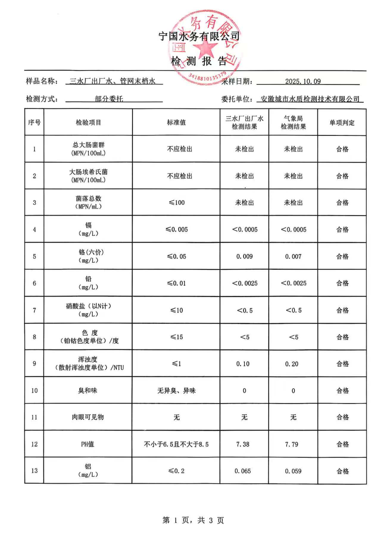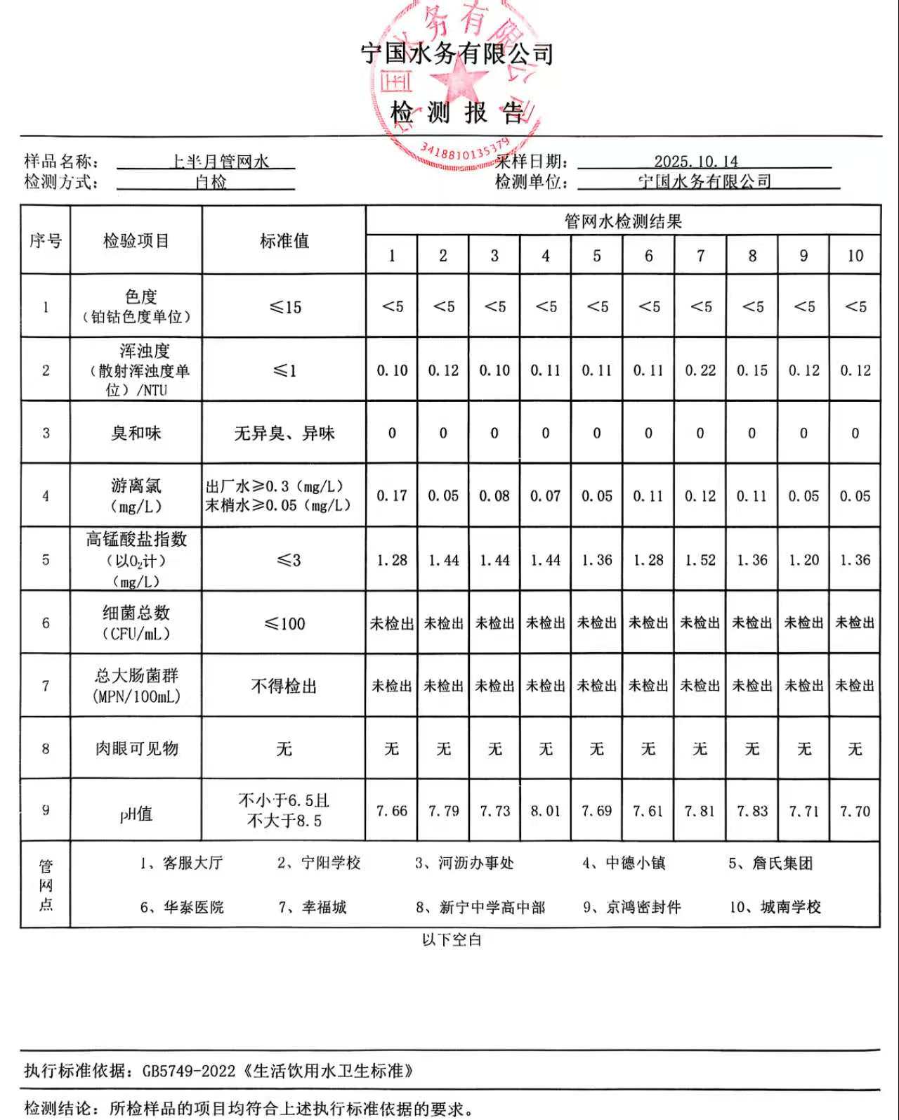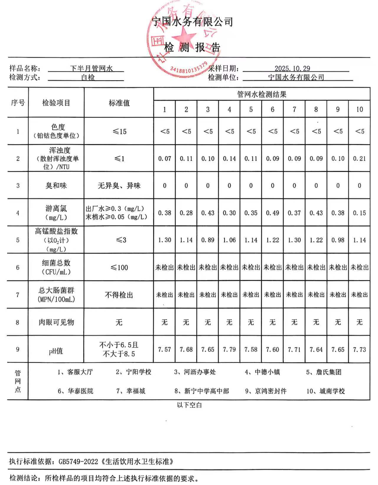 2025年10月份水质报告